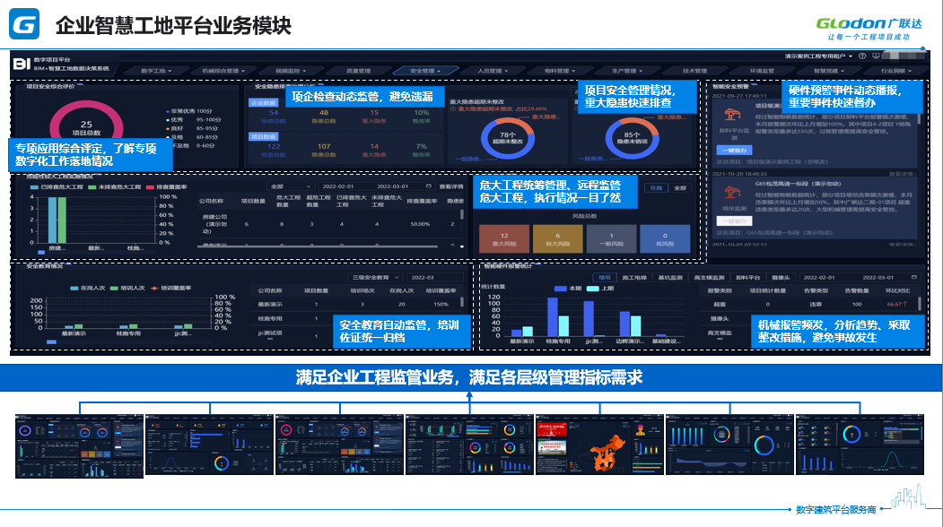 通过将视频监控接入智慧工地平台,管理人员可以远程实时了解现场一手情况。AR全景方面,除了传统的球机和枪机外,还可以在现场安装AR全景摄像机,虚拟现实叠加,180°项目全景尽收眼底,宽视野,信息不遗漏。整合巡检记录仪,可以实现移动巡查全过程AI识别和储存,联动4G网络广播实现可感可知可叫停。AI识别方面,除了摄像机本身的实时监控外,在智慧工地平台中独立研发了AI算法识别,通过十余种算法对视频图像进行识别,自动识别并抓拍现场安全隐患以及人员违规行为,比如未佩戴安全帽,未穿戴反光衣、明火、烟雾、口罩佩戴、人员聚集等。