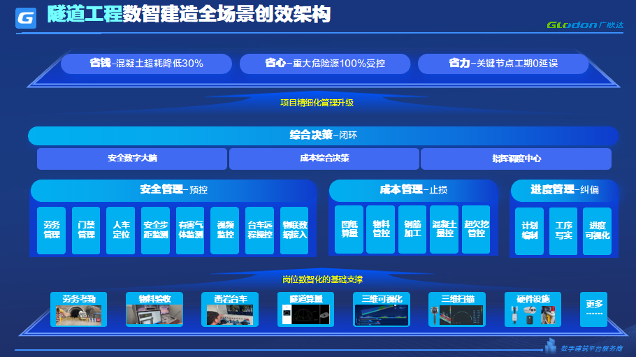 隧道工程数智建造全场景创效架构,以岗位数智化为基础支撑,构建了安全管理预控、成本管理止损、进度管理纠偏三大核心模块,并通过安全数字大脑、成本综合决策等形成综合决策闭环,最终实现 “省钱、省心、省力” 的创效目标,推动项目精细化管理升级。